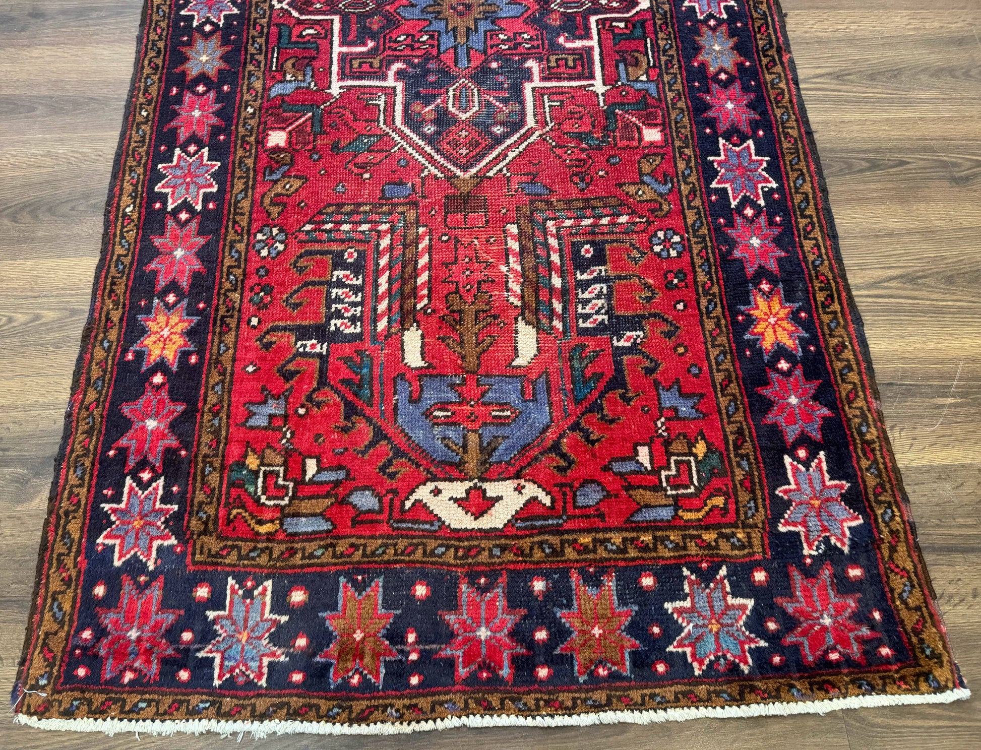 Persian Heriz Karajeh Runner Rug 3.7 x 12 ft Red Navy Geometric Medallions
