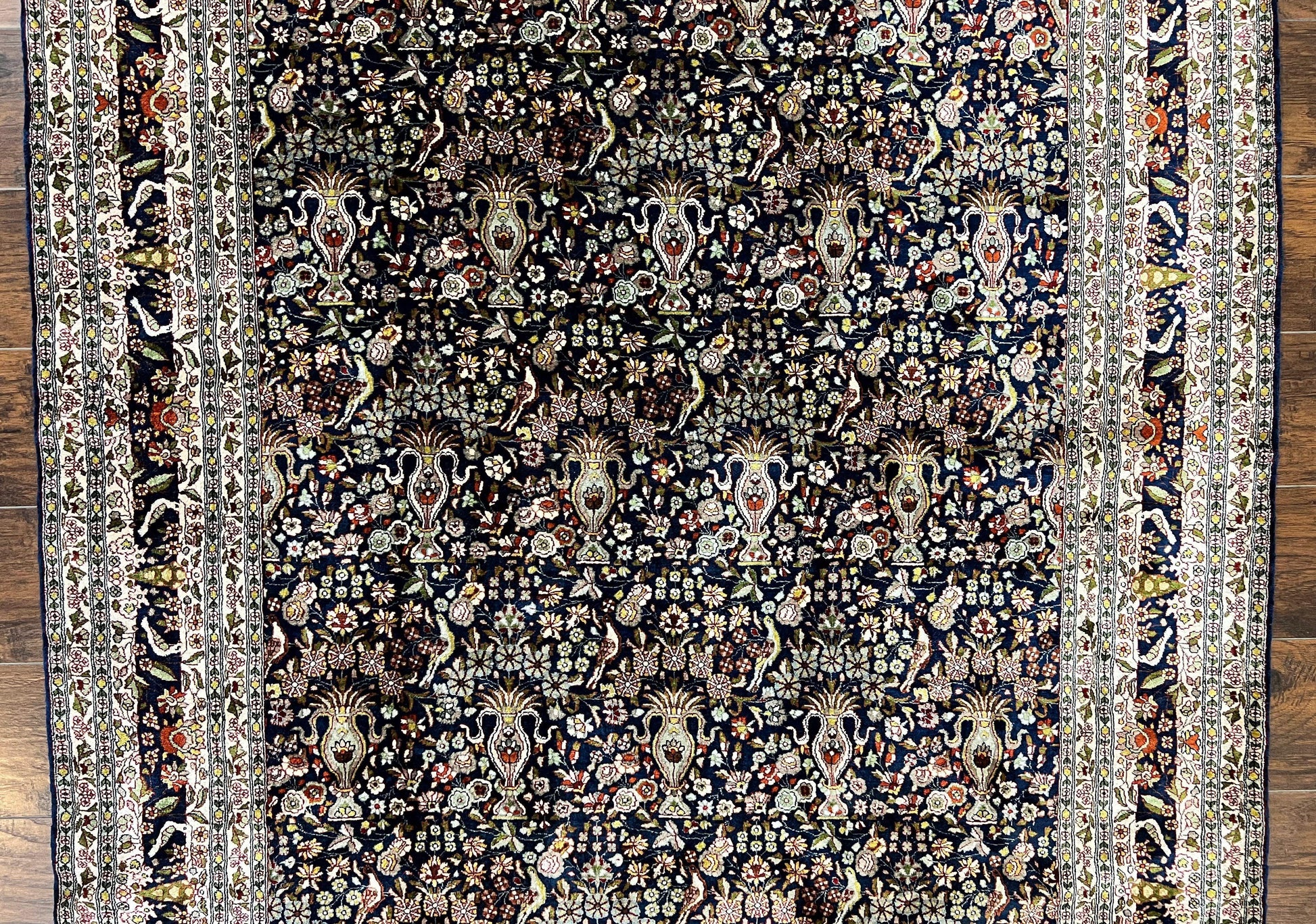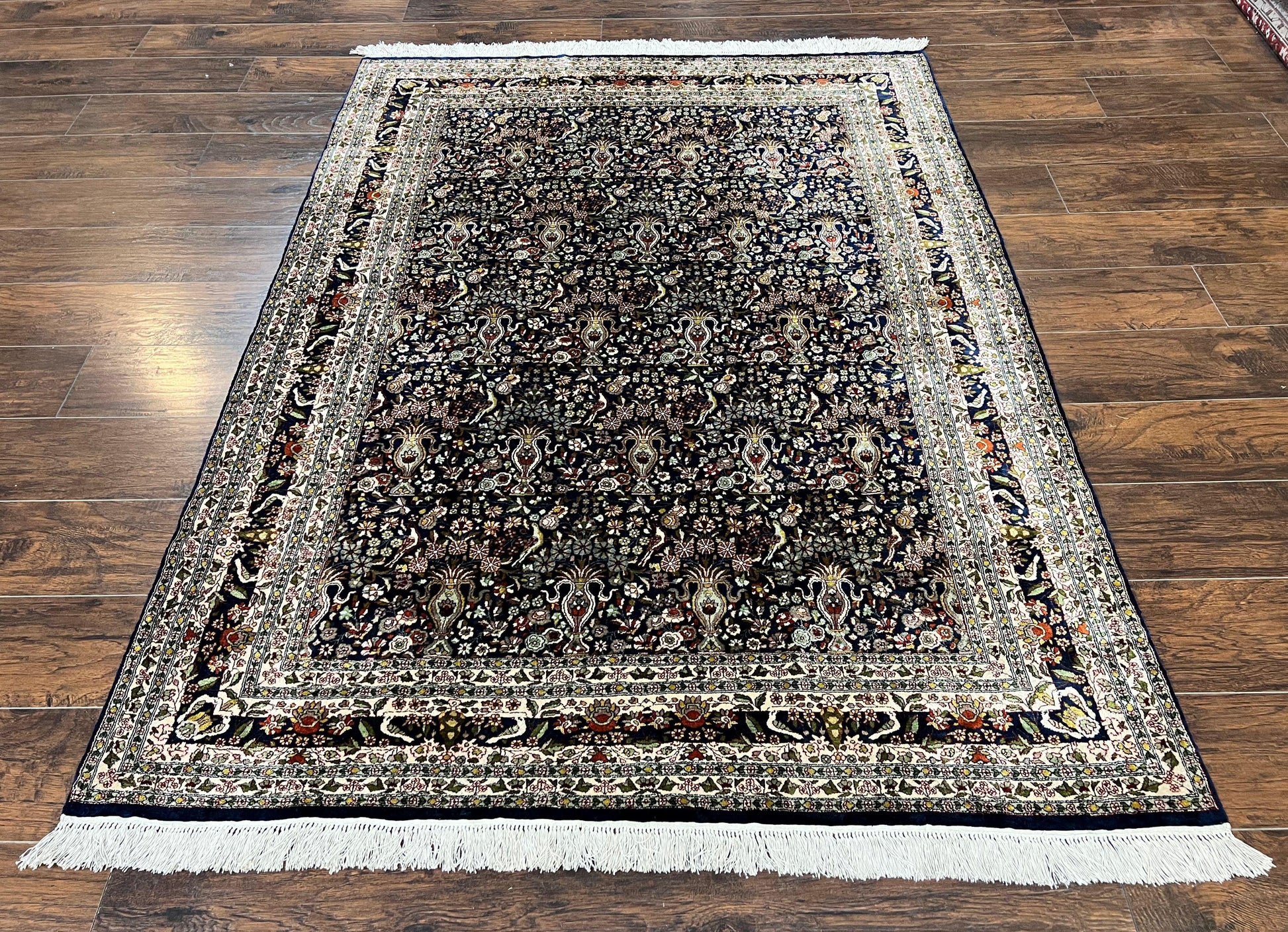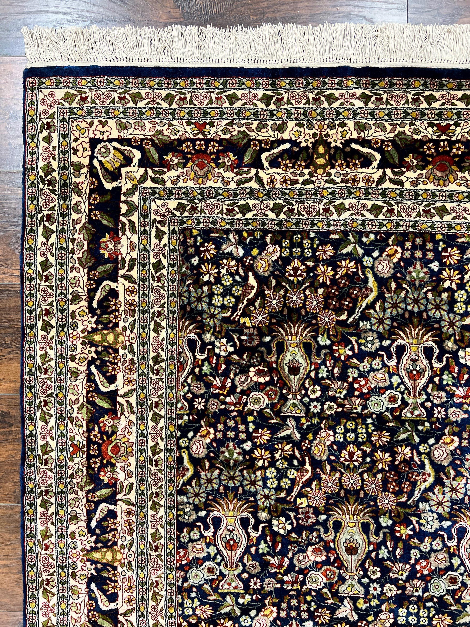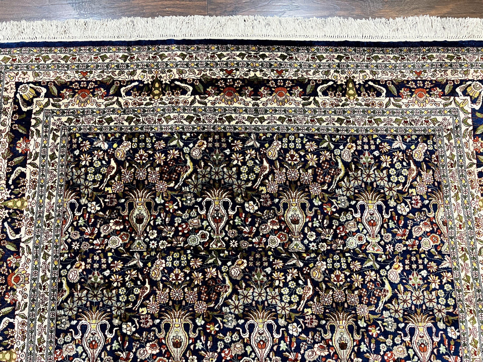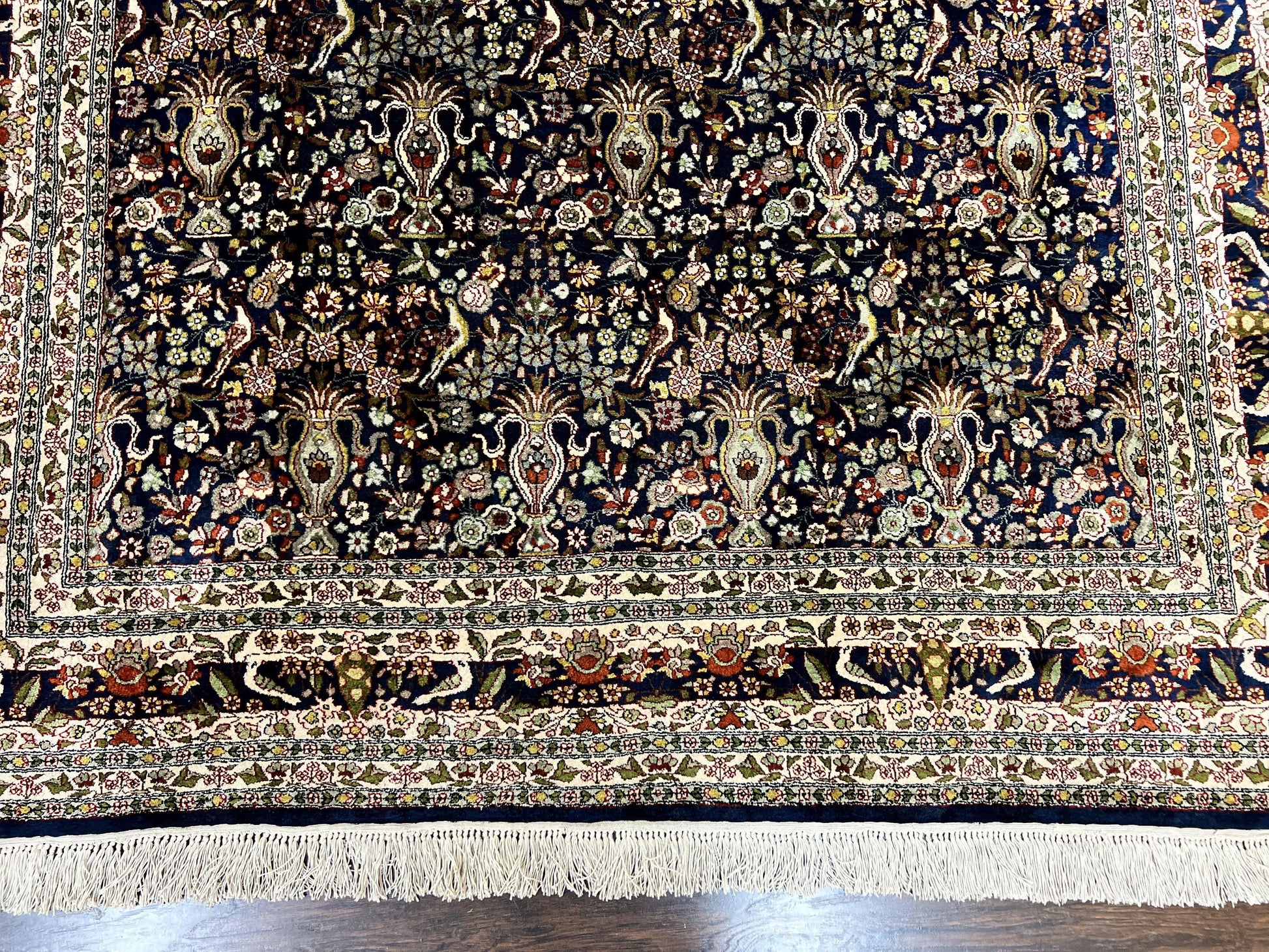 Kashmiri Silk Rug 5x7 Navy Blue Indo Persian Hand Knotted Birds Pattern Silk Carpet
