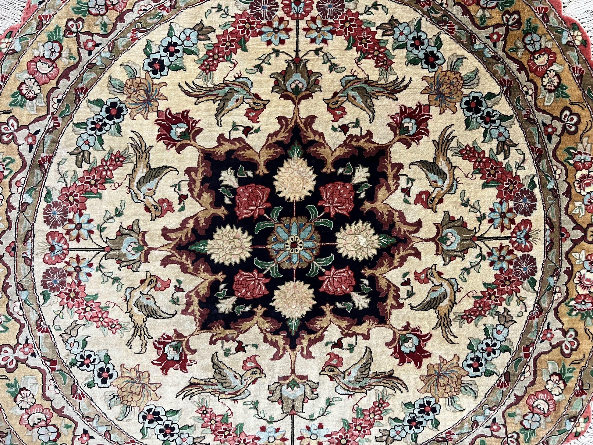 Silk Persian Tabriz Round Rug 3x3 Ft Hand Knotted Carpet Cream Gold Floral Birds
