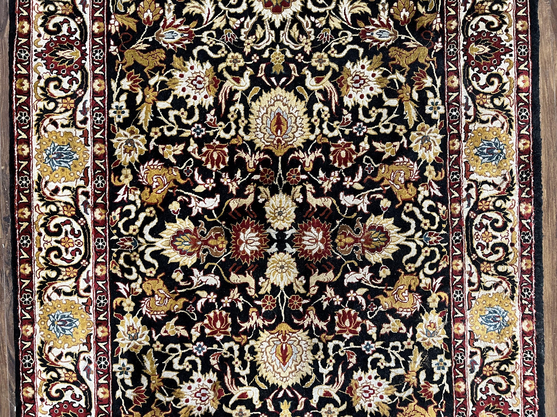 Sino Persian Silk Rug 3x5 Vintage Hand Knotted Carpet Black Ivory Gold With Floral And Animal Motifs