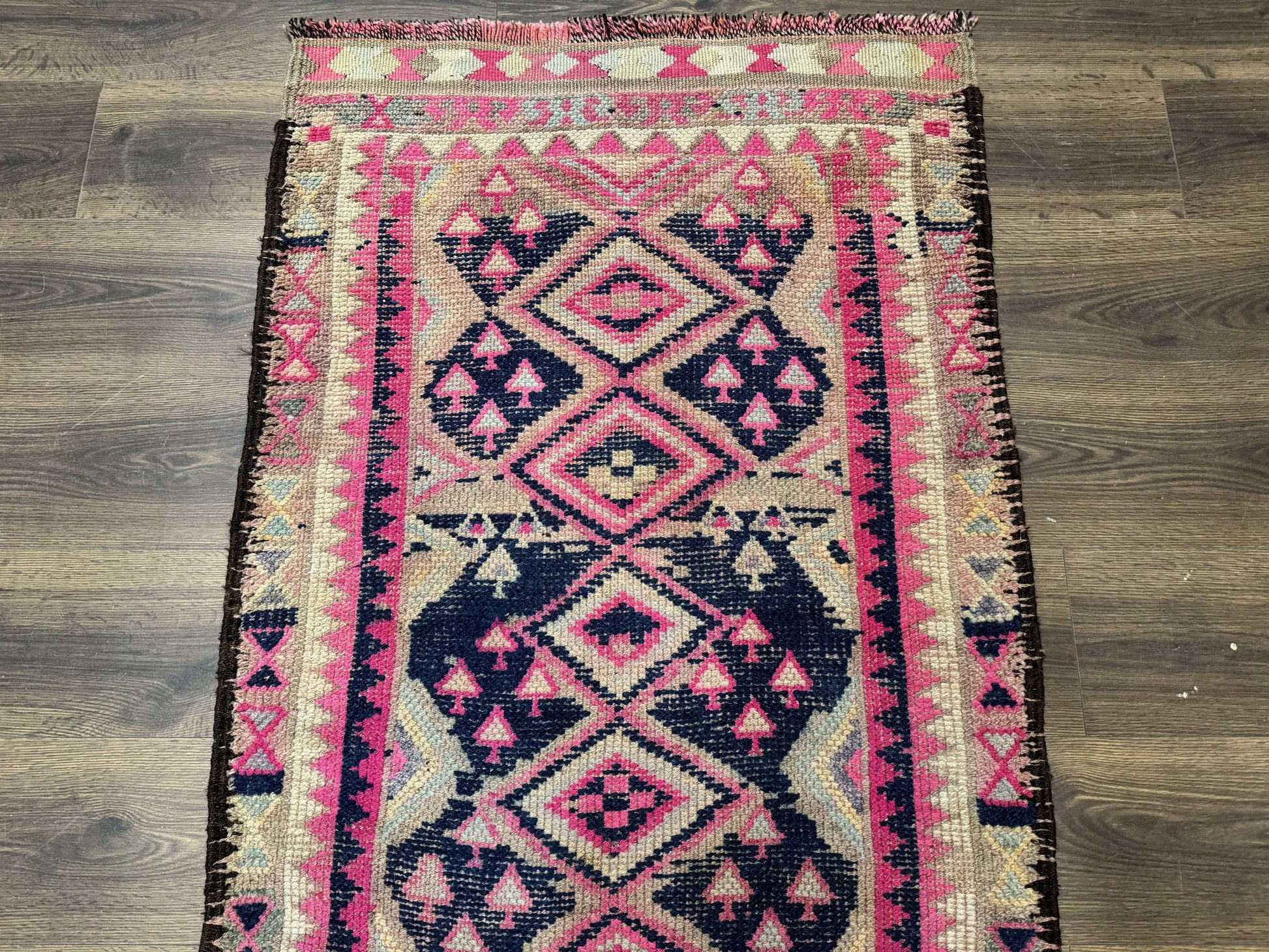 Discover a vintage Turkish runner rug that’s perfect for long hallways or kitchen passages. This handmade, hand-knotted wool piece from Turkey adds a bohemian, geometric touch with pink and navy blue tones.