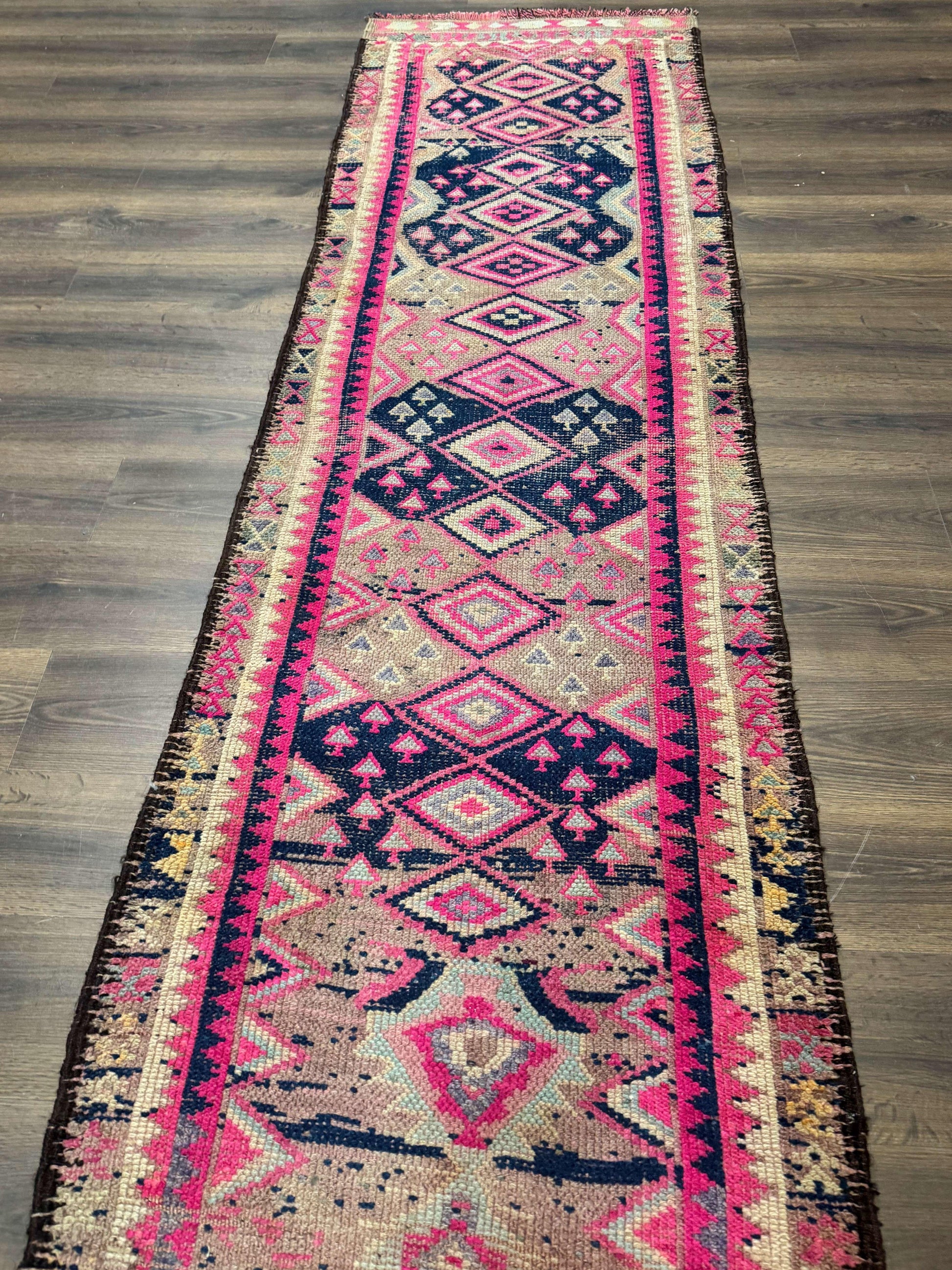 Turkish Runner Rug 3x10 Pink And Navy Blue Bohemian Hallway Kitchen Vintage Geometric Tribal