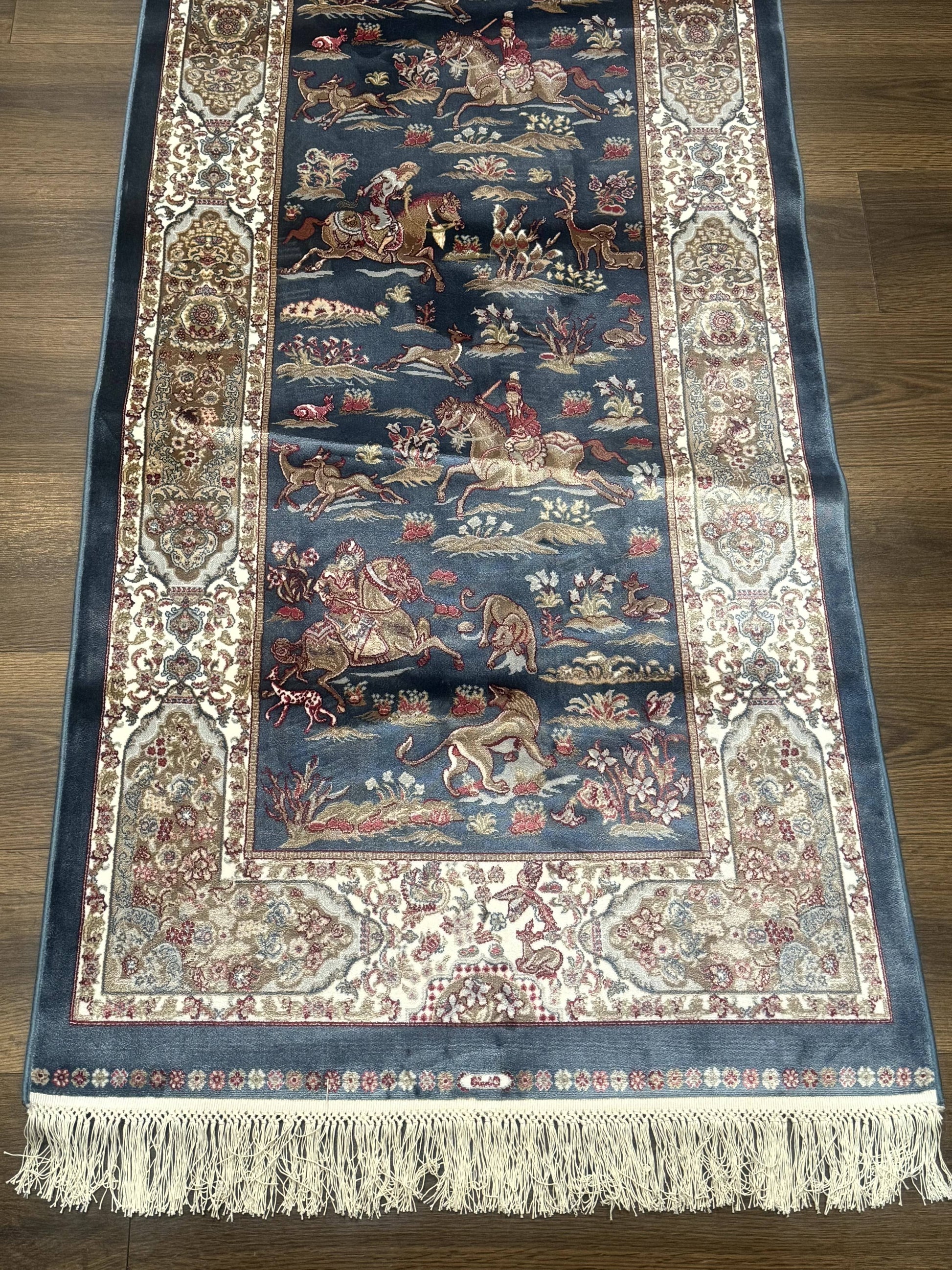 Elevate your hallway, entryway, or narrow living space with this Turkish bamboo silk rug runner. This 2'6" x 6'7" contemporary piece blends a blue and ivory palette with a hunting design, delivering a soft, silk-like feel and durable construction for everyday living.
