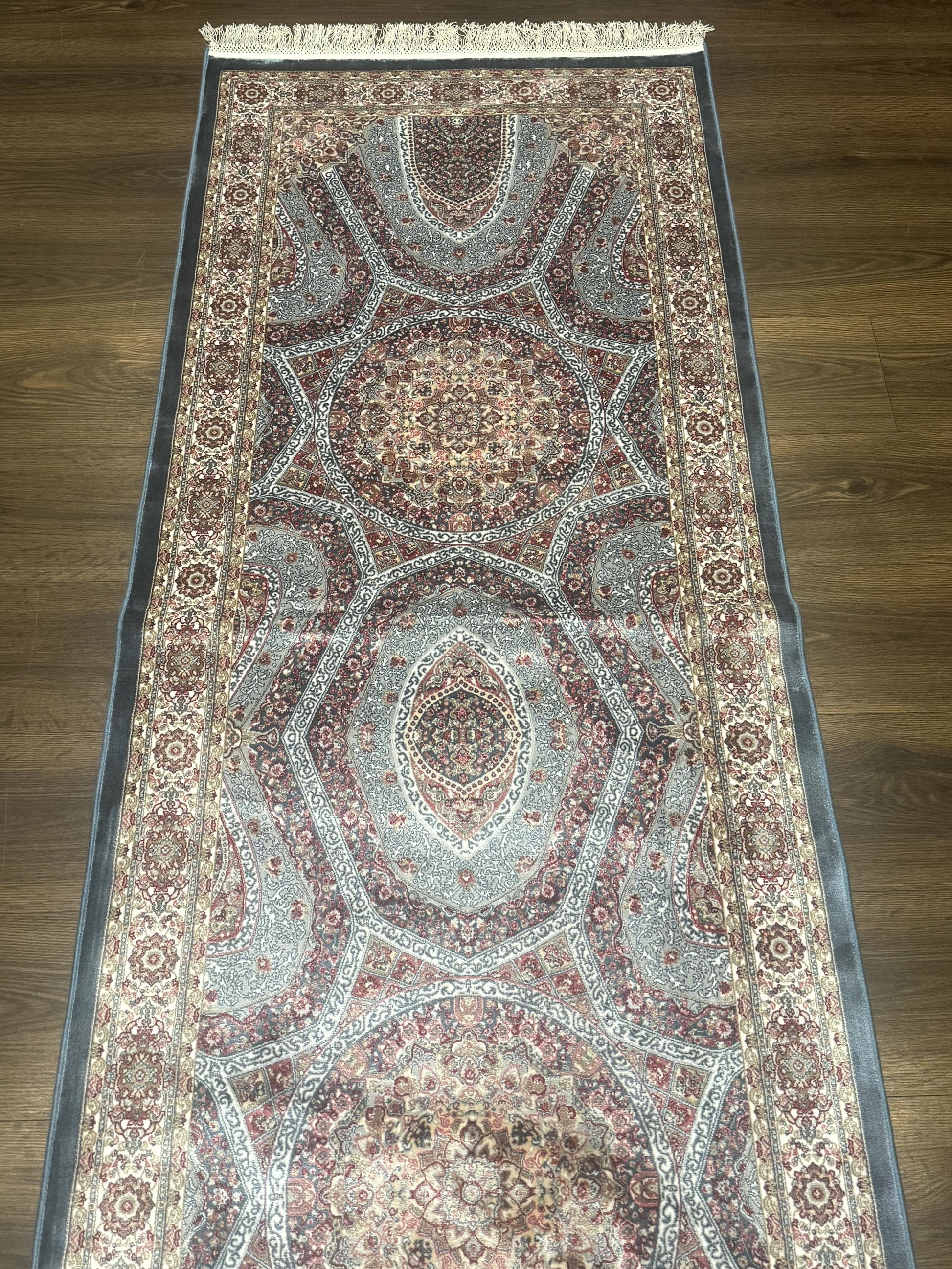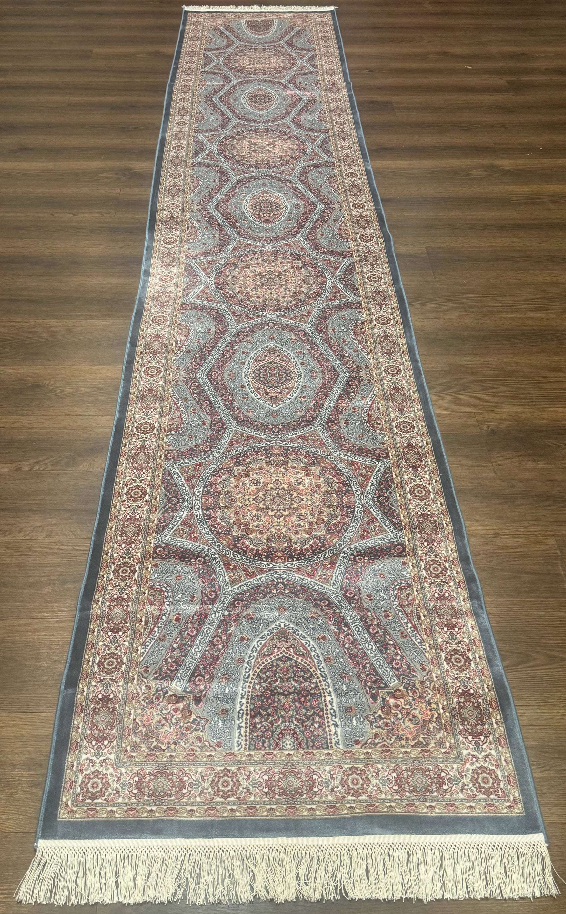 Turkish Silk Runner Rug 2.6 x 13 Blue Dome Design Bamboo Silk New