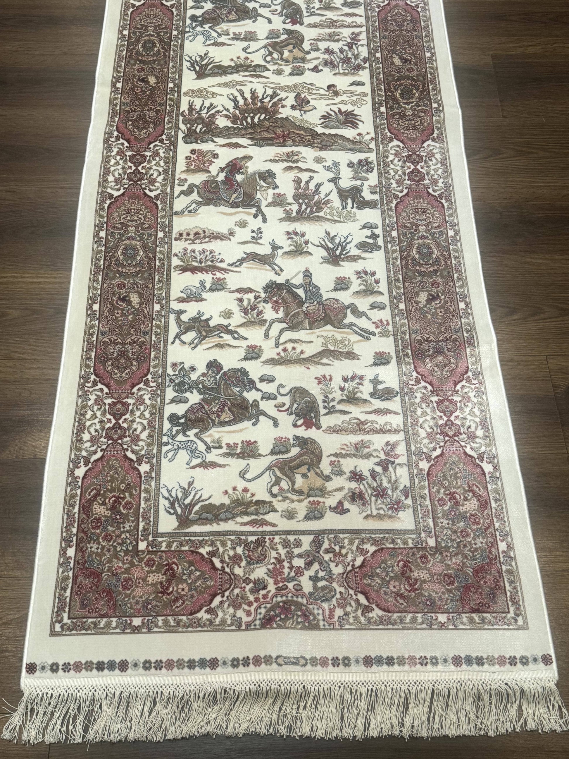 Turkish Silk Runner Rug 2.6 x 8 Ivory Bamboo Silk Hunting Design