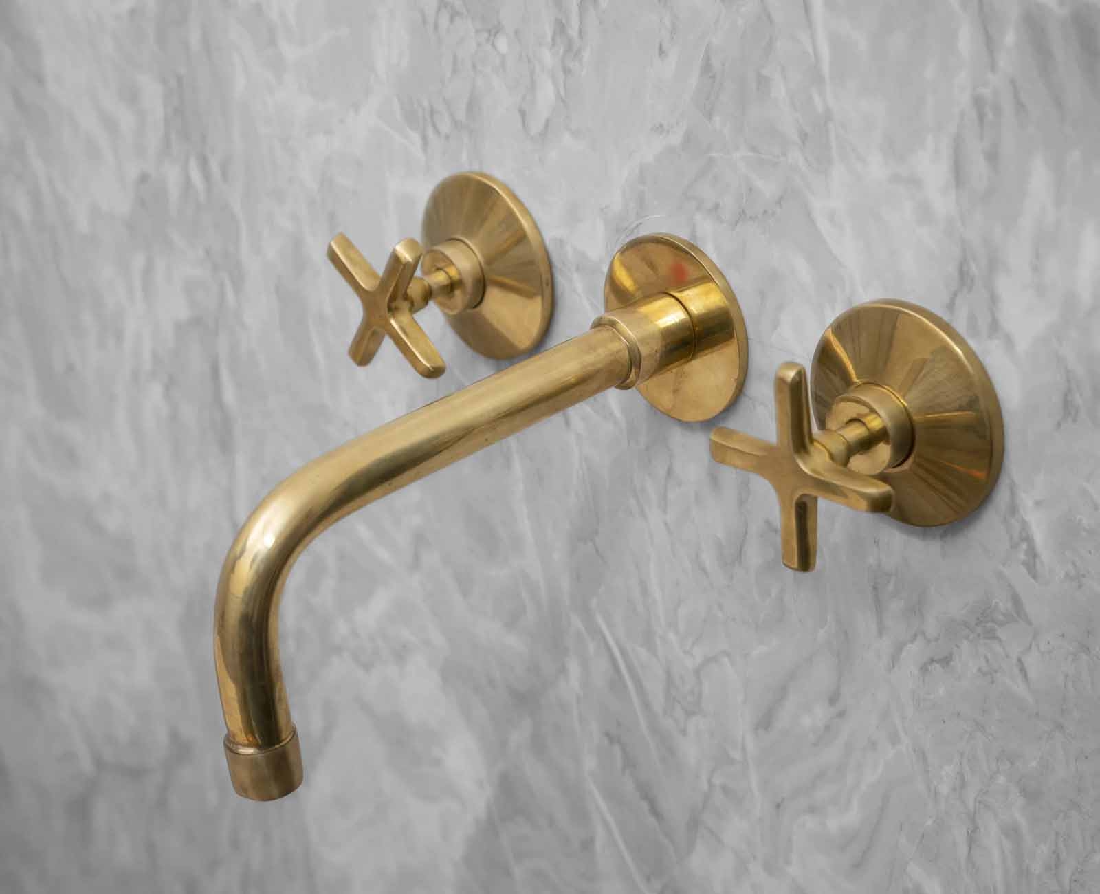 • Stylish Design: Enhance your bathroom with our wall-mounted bathroom faucet, featuring elegant cross handles and a solid brass construction, including a tub filler and an unlacquered brass sink faucet.
